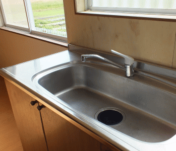キッチンシンク、窓の外は畑です。 |