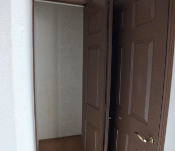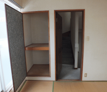 2F和室の押し入れと入口ドア、奥は3Fへの階段 |